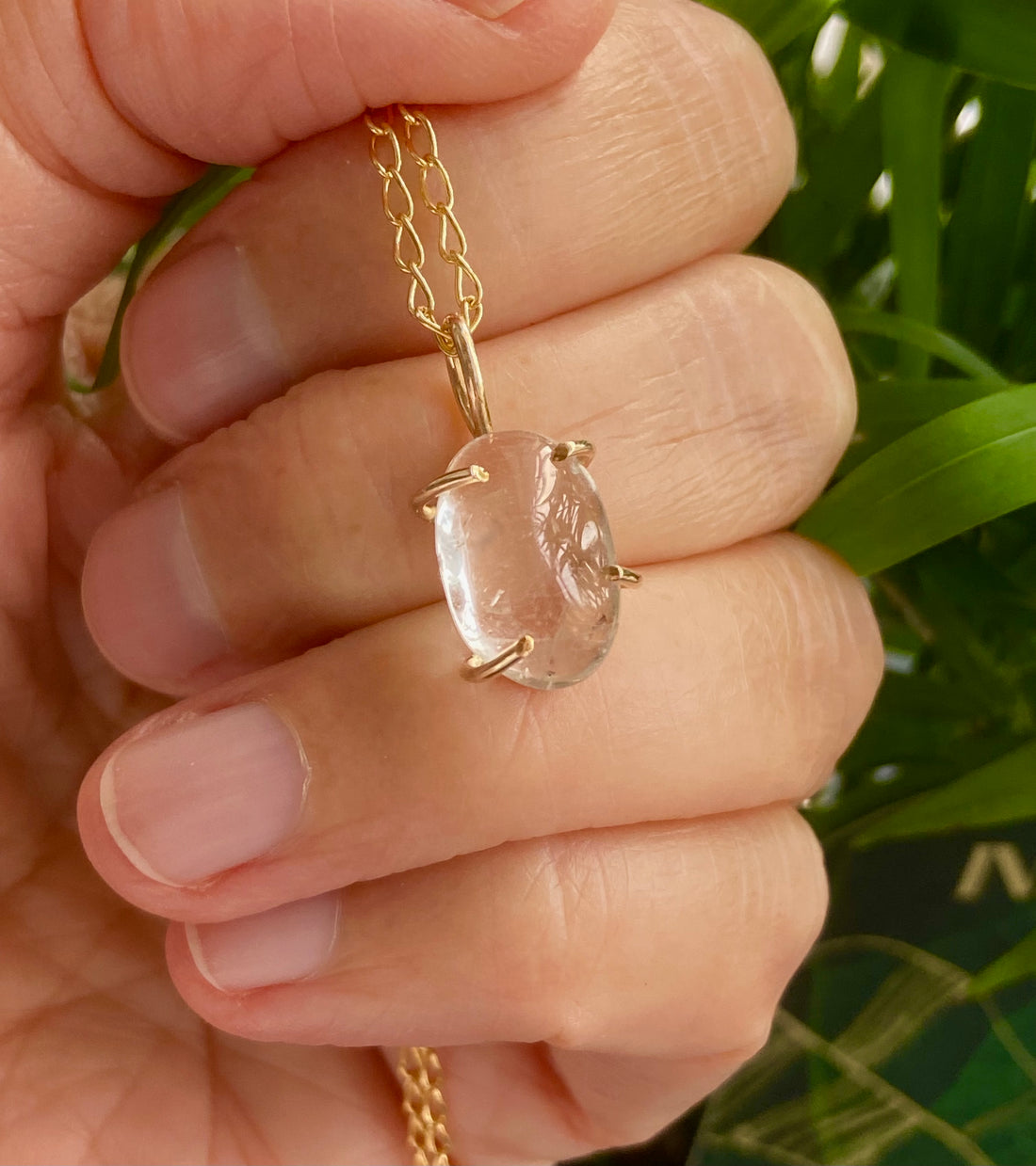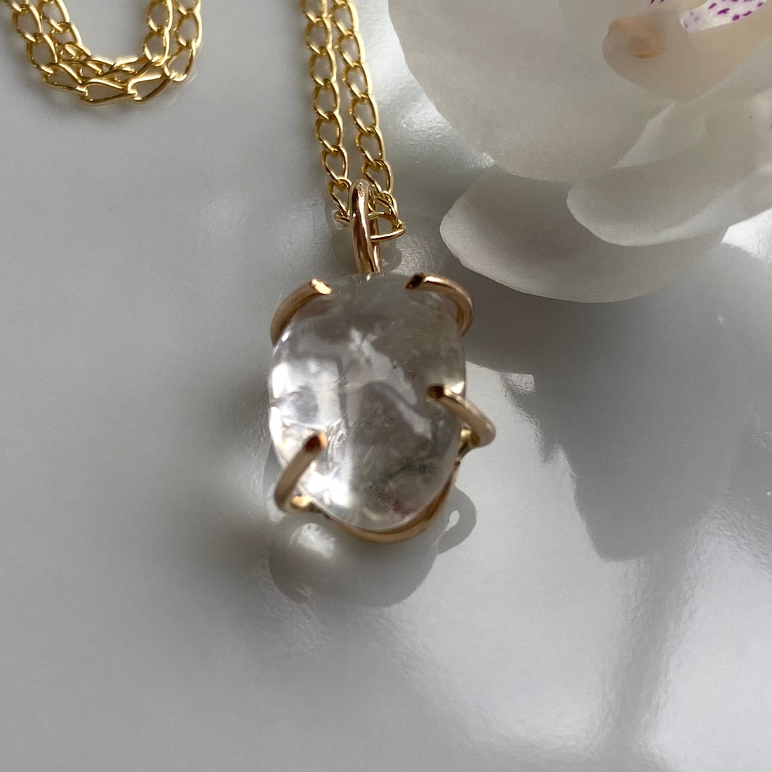 Stunning nugget of natural Brazilian Rock Quartz made into a pendant with 4 golden prongs holding this luminous smooth freeform gemstone.