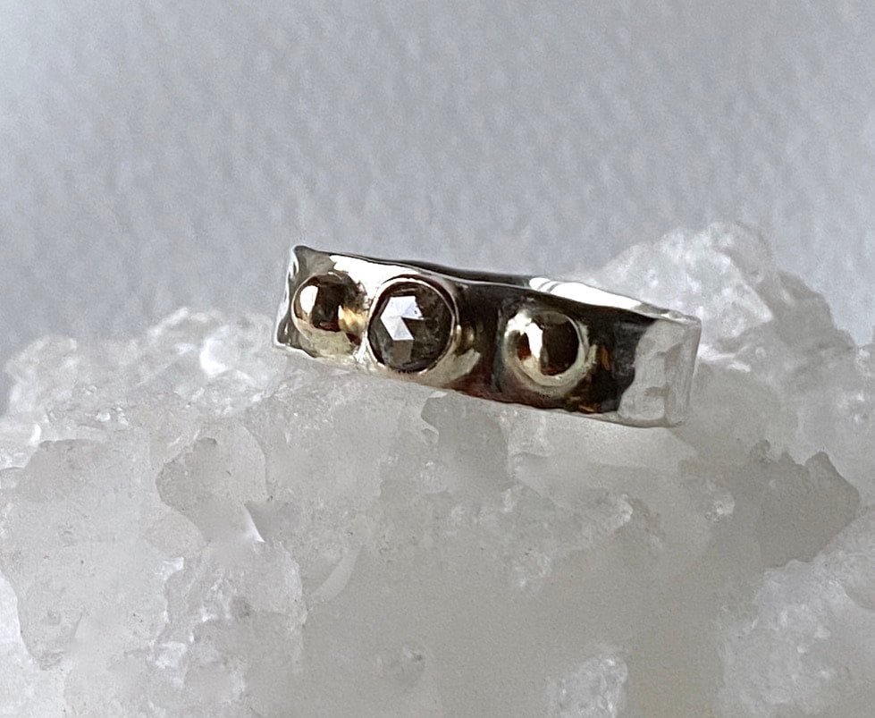 The 5 mm wide Sterling Silver ring band has been hammered to create an uneven organic texture.
