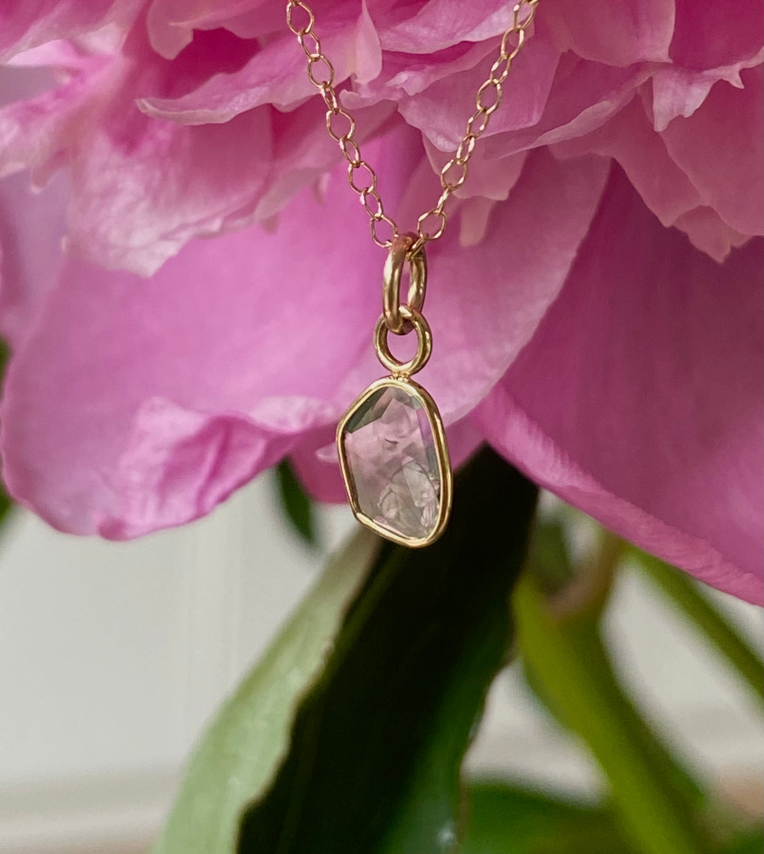 The hand cut freeform Diamond slice, which measures approximately 9 x 6 mm, has an amazing shine and brilliance when it catches the light. It is water clear with some unique dark inclusions, which are typical for salt and pepper diamonds. These inclusions are mostly other minerals or oil. It has been set in a 18k gold bezel setting with a small bail, hanging from a larger 18k gold ring. Total length of the pendant including both bail rings is 1.5 cm.