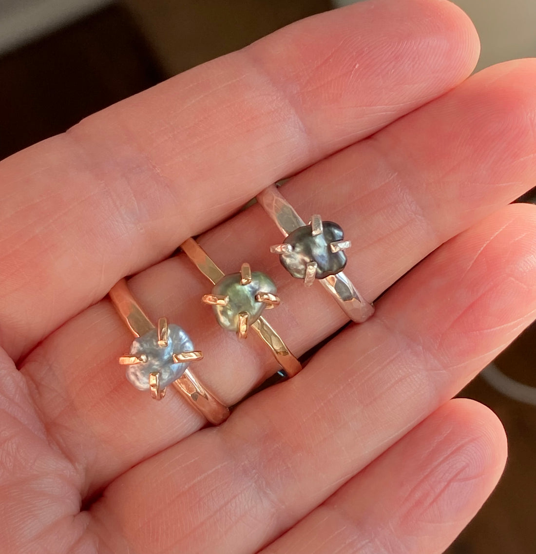 You can choose from a sterling silver ring with a dark charcoal Tahitian keshi pearl (no. 1.), 14k yellow gold filled ring with a grey Tahitian keshi pearl with a golden sheen (no. 2.) or a 14k rose gold filled ring with a silver grey Tahitian keshi pearl (no. 3.)