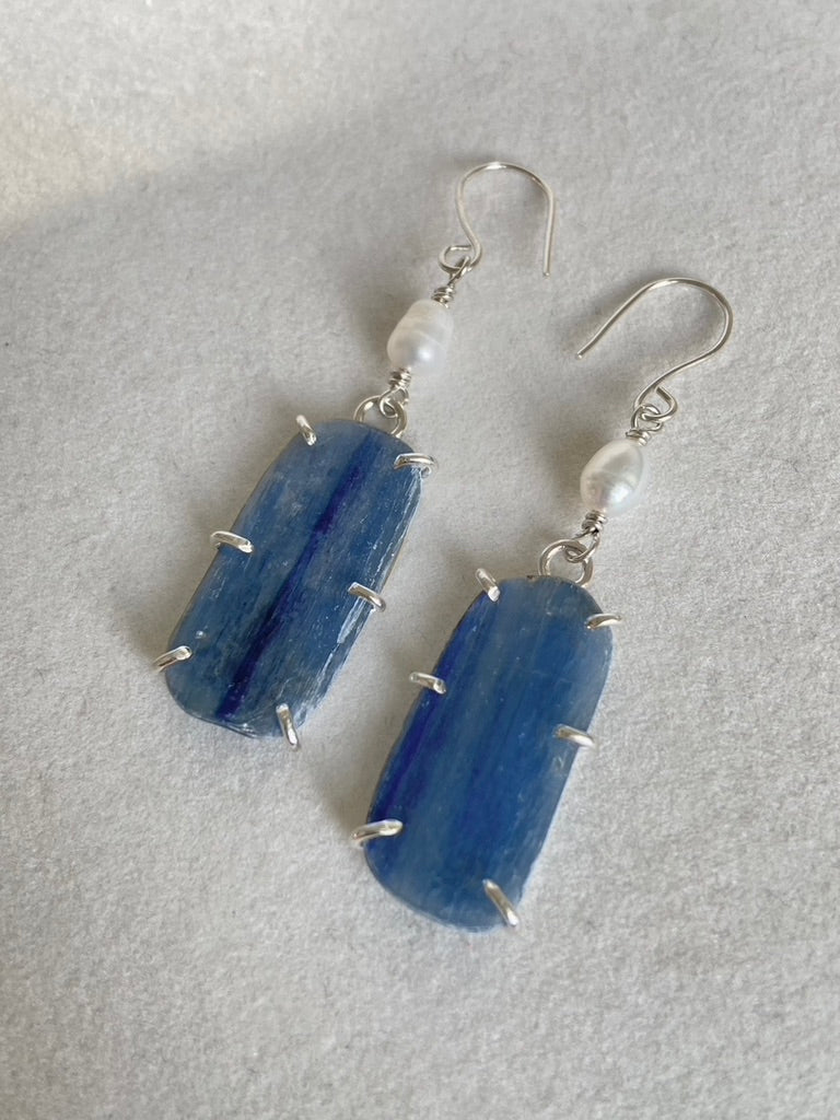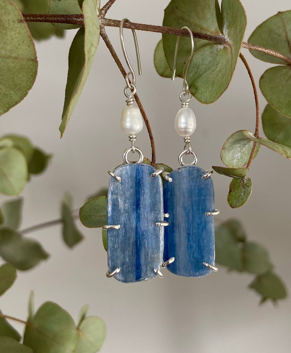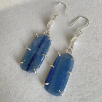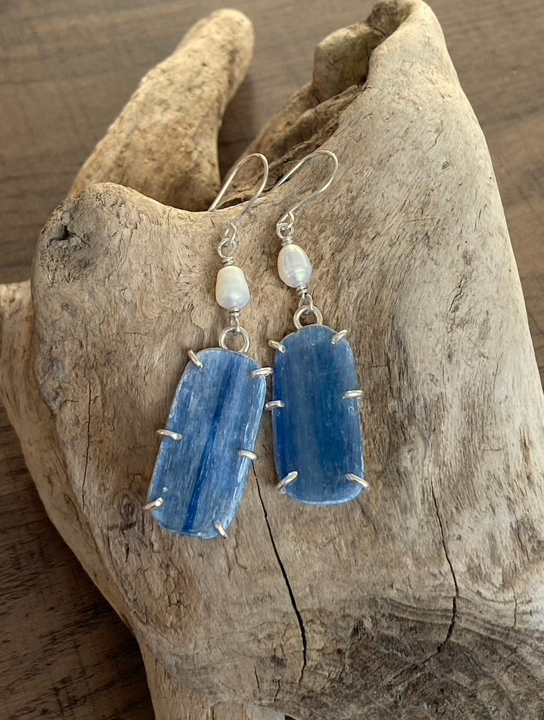 Long sterling silver earrings with lovely denim blue high quality Kyanite blades with a beautiful pearly sheen, originating from Brazil, combined with off-white freshwater Pearls.
