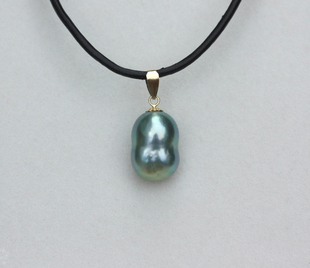 This stunning and lustrous South Sea baroque pearl features a captivating blue hue with a subtle hint of gold. Set in a solid 18k gold setting with a solid 18k gold pendant bail.