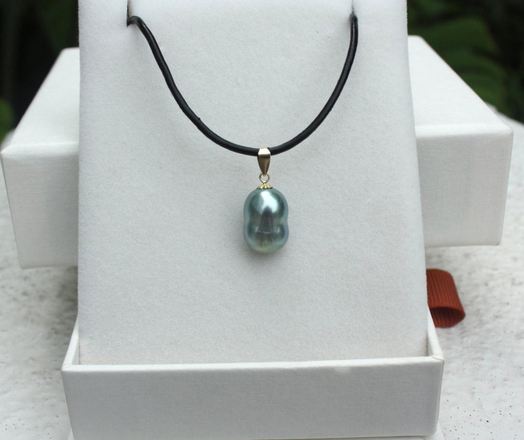 The baroque pearl measures 12 x 7.3 mm, with the total length of the pendant including the bail, reaching 19 mm. The baroque shape and the blue color make this truly a unique pendant.