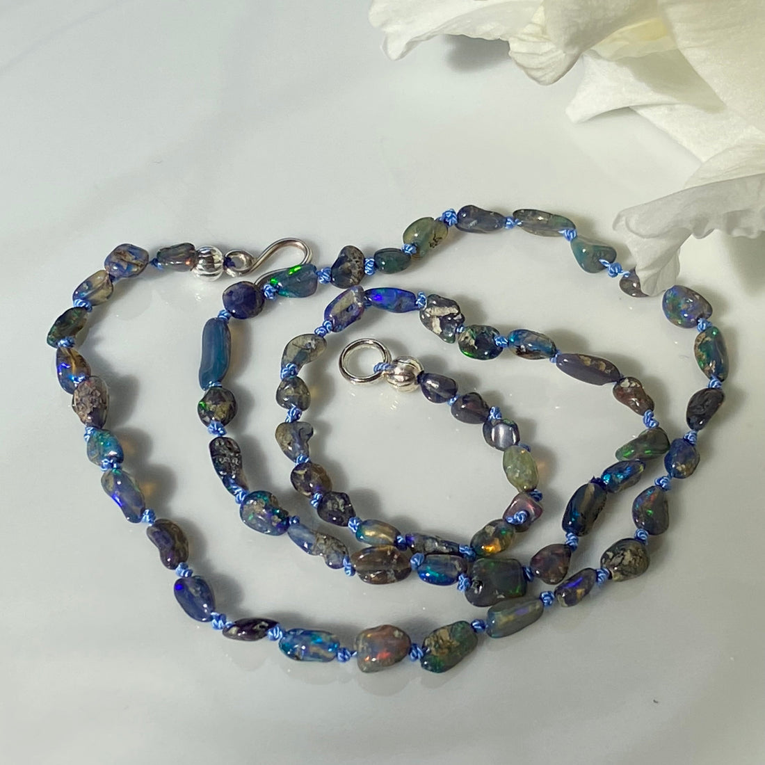 Stunning short raw Black Opal necklace, meticulously hand-knotted with light blue silk to match the Opal's natural beauty, and finished with a handcrafted sterling silver hook clasp.