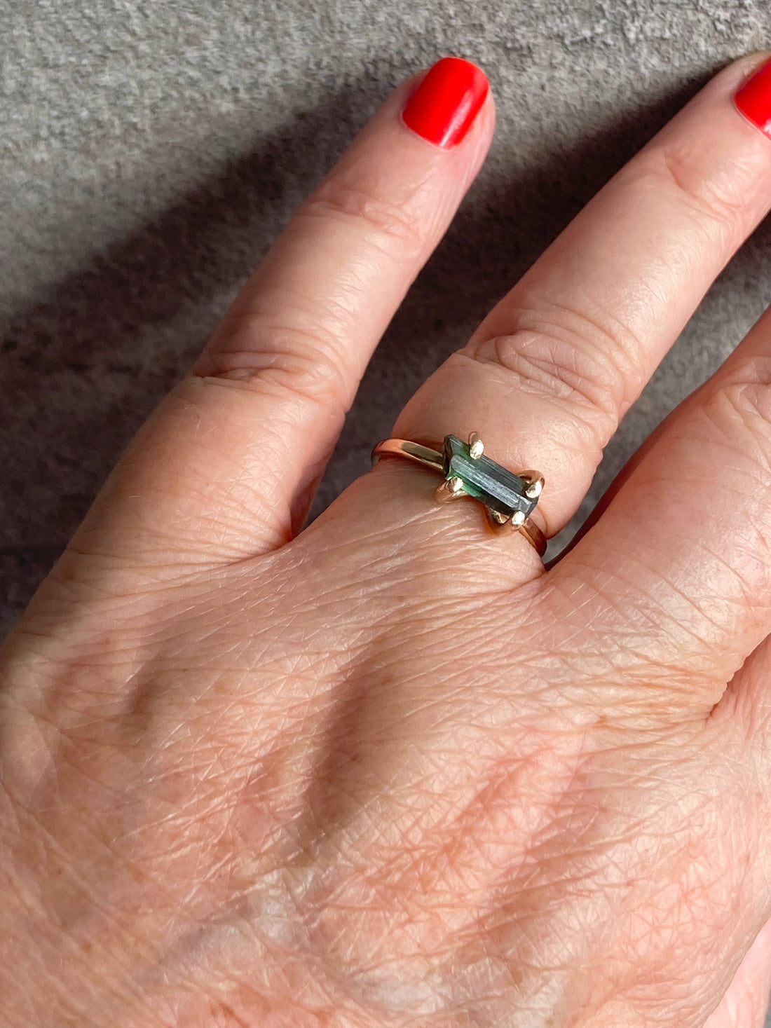 This Indicolite Tourmaline crystal (size 10 x 4 x 4 mm) has a deep teal greenish blue color and it is nearly water clean, with only very few inner lines and inclusions. One end of this Tourmaline crystal is lighter than the other one. It has been set in a custom handcrafted four prong setting made of 14k gold filled material. The hammered 14k gold filled ring band is about 2 mm wide.