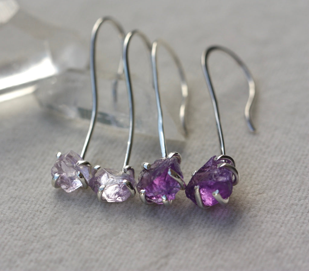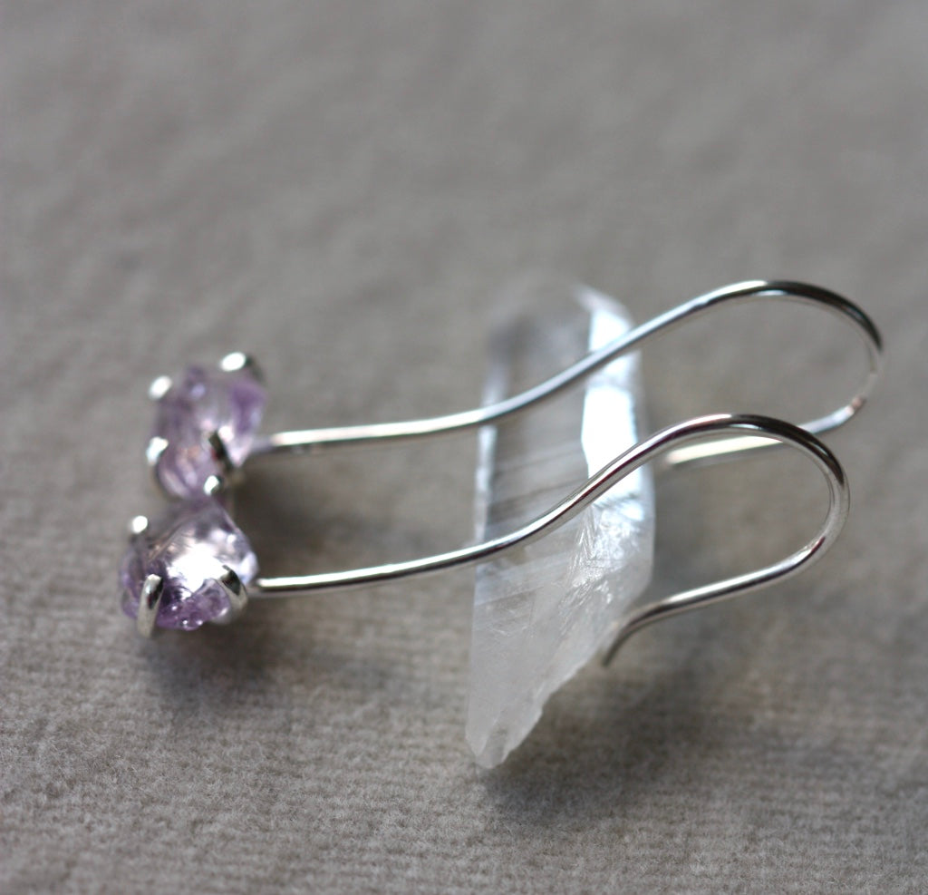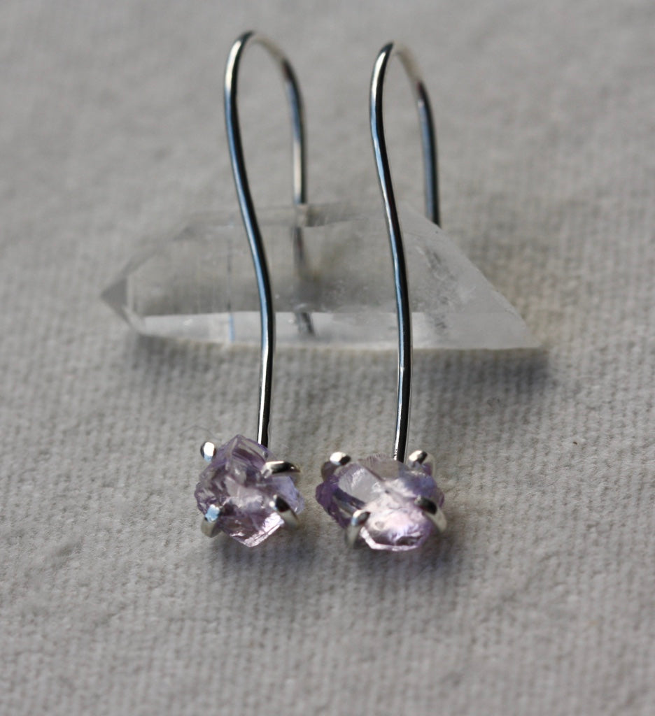 Sterling Silver long ear hook earrings with raw, uncut and unpolished crystals of Lavender Amethyst.