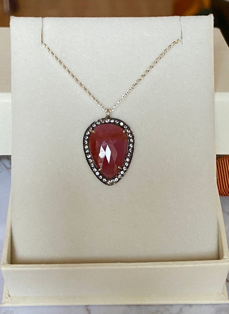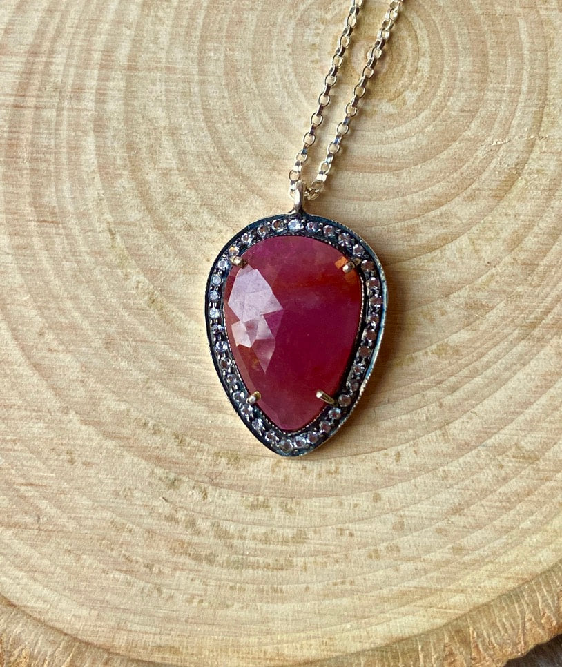 A large pendant of natural red Ruby which has been manually rose cut and has an amazing sparkle. It is surrounded by pave set natural brilliant cut White Topaz gemstones.