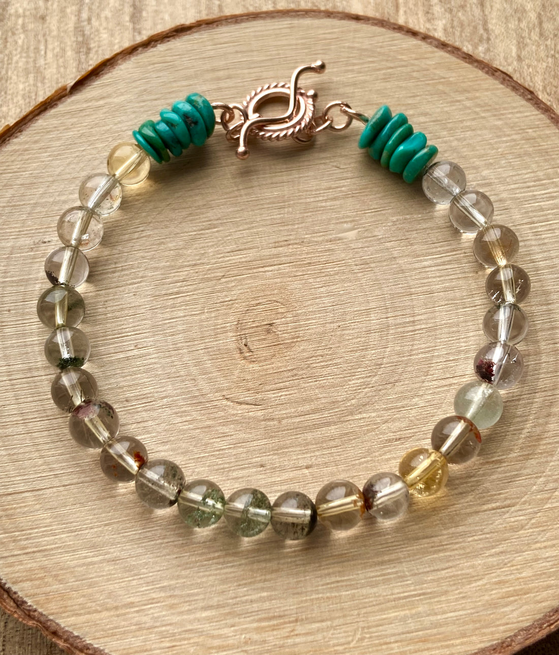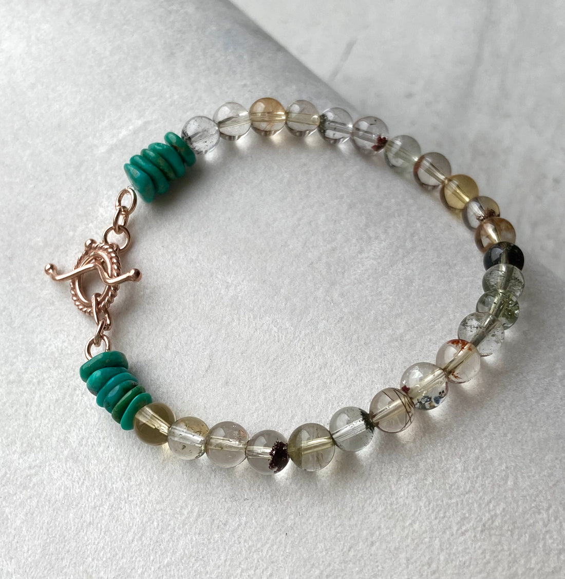 Lovely beaded bracelet made of Lodolite, also known as Garden Quartz with natural Turquoise accents and a 22k Rose Gold vermeil toggle clasp.
